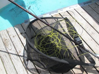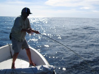 On about my 10th cast disaster struck. I heaved back in my backstroke and my reel crashed to the bottom of the boat. At first I thought I simply didn’t attach it to the rod well enough, but when I picked it up the screws that hold the reel to the reel seat were gone. I’ve used this set up a bunch in Baja the last year so I was dumbfounded! The airlines I thought! Then the stress took over my body as here I was 10,000 miles from home at a place I may never have a chance to cast too again having equipment failure! I was losing time! Then without saying a word I stripped the 700 grain line off the reel carefully laying it in my handy stripping basket. Then I took the floating line off my 10-weight set up and reeled the 700 grain on it. Then as not to wreck the floater I reeled it back on the busted reel. And within ten minutes I’m proud to say I was casting again. A bit disgruntled, but casting again.