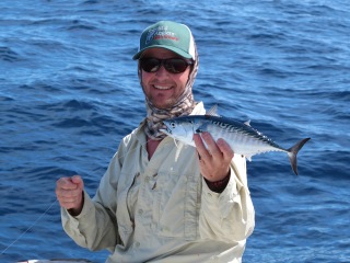 Now we were at a time of debate. Granny and I had made it very clear to George that we wanted to release all fish except a few for dinner. We already had a few skipjack tuna. George reluctantly asked if we had to let it go. I know how delicious a wahoo tastes and this fish looked every bit like a wahoo. “George, we will eat him too”, I shouted. George was relieved and on the next pass George sunk the gaff. I’d landed what will probably be the fish of the trip, and perhaps 2011, a gorgeous narrow-barred king mackerel!