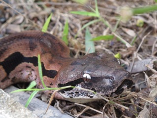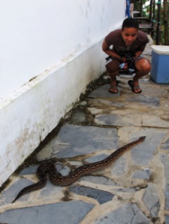 home and Granny can work some overtime. I reluctantly gave George $600 up front. I hate doing that in foreign country but I can’t blame him for wanting it. He needs to organize his boat, get fuel etc. We are scheduled to meet him at 7:30 AM tomorrow. He says he’s seen a fly rod and he has a plan. I’ve heard that before so Granny and I are just mentally prepared for an adventure. We spent the rest of our day fishing the rocks while the tide rolled back in. I stuck to the same rig and while Granny checked out the cool crabs and shells of the tide pools I landed one more new species. It was a mono fish, nothing spectacular but a new one. We also played with a squid that attacked my fly every time I cast. Then catching me by surprise, a decent sized grouper nailed my Clouser and escaped by tangling me in the coral. That led to my first swim of the trip to retrieve my fly line. The last thing I need is to lose a fly line on the first day. After fishing we chilled out on our room porch with a tall cold beer. Then we headed back up to the main porch. Granny was walking a good distance ahead and laughed when she noticed the camp help put a fake snake on our walk. I thought it was pretty funny too. You can’t scare the Americans we thought. But then the snake moved. It was a 6 foot long tree boa that started slithering along with us as if he too was headed for dinner. Granny and I don’t mind even big snakes. We have neat snake stories from previous travels in Africa that prepared us for life with snakes. Our first reaction now is to keep it quiet as you never know how the camp help will react. We don’t want them to see the snake