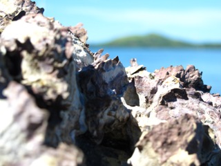 how low but I can tell you now it was low. Today we had a fluctuation from low to high of about 18 feet! The terrain is basically very calm sea with rugged slippery rocks covered in razor sharp oyster-looking shells. You can wade in the water but with care. There are gorgeous corals everywhere and spiny black sea urchins that could ruin a trip in a heartbeat. I tossed a yellow and red Clouser minnow about a size 2 on my 7-weight Ross with the floating Scientific Angler Sharkskin Tropic line WF7F. The rod would be overmatched if I hooked anything big, but for prowling the first morning it would do. Other than a few needle fish thrashing on my fly, action was slow. I landed a gorgeous